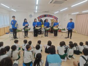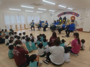年中年長組の練習している曲や、トトロや秋の曲のメドレー等、身近な曲を楽しめました。ジャンボリーミッキーやおどるポンポコリンの曲に合わせて踊る事も出来ました。楽器の紹介や、ドラムに付いている楽器の数を当てるゲーム等、楽しい演出もありました。「アンサンブルームーン」さん今日はありがとうございました!!