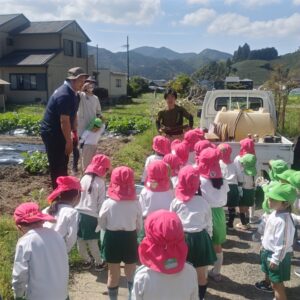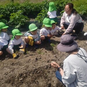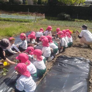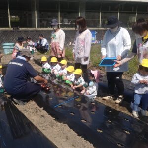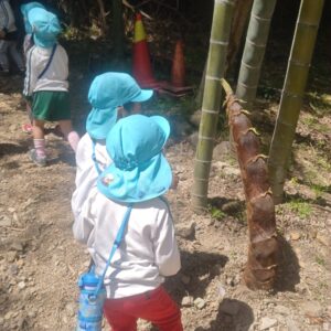 今日は、昨日年長さんが買いに行った、苗と種等を植えに行きました!すいか、メロン、ズッキーニ、枝豆、ポップコーン、きゅうり、人参等です。水やりも頑張って、美味しい野菜を育てようね♪年中さんは、筍の観察にも行きました。