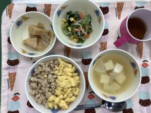 9枚目は、今日の給食です。筍の煮物です。そぼろご飯の下は、筍ご飯です!美味しかったかな?