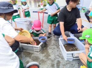 子ども達と先生が幼虫の糞を取り除いてくれて、一緒にケースに移しました!