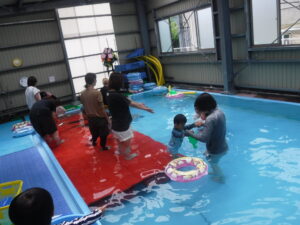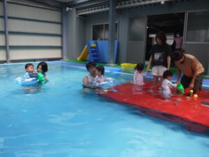 初めて見るプールにビックリするお友達もいましたが、興味を持つと浮き輪やおもちゃで遊び出す事が出来ました。