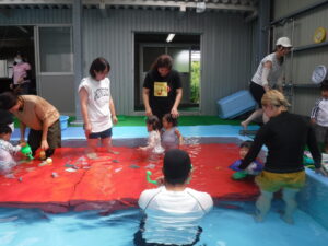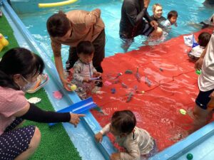 浅い場所(赤い台)で魚やタコ等のおもちゃ拾い、浮き輪を付けて深い場所でプカプカ浮かぶ子もいました。